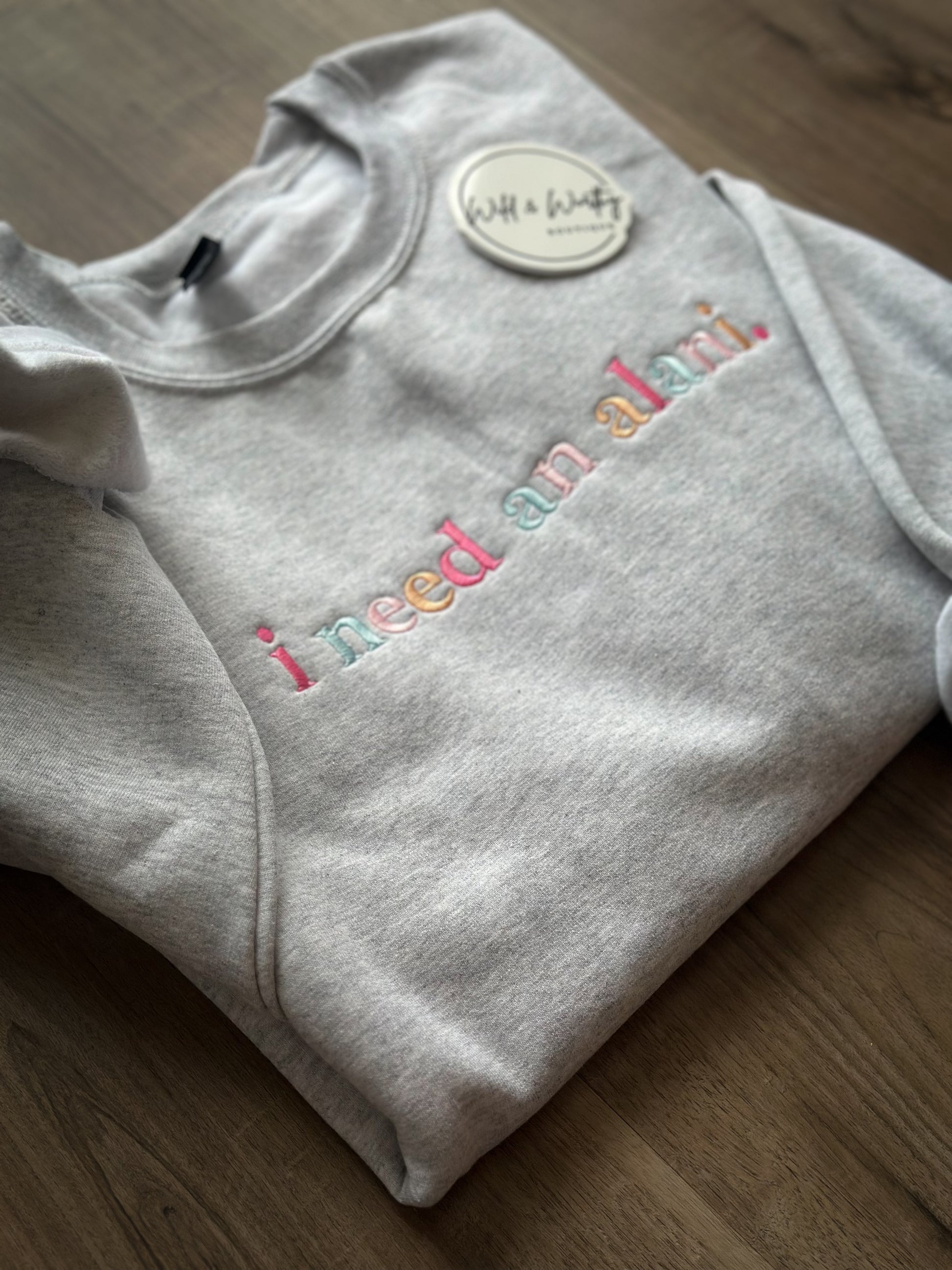 Because some days just require an Alani. This cozy ash gray sweatshirt features a simple, playful script that reads “I need an Alani” in soft alternating colors of pink, blue, and peach. Easygoing, comfy, and effortlessly cute, it’s perfect for running errands, school drop-off, or lounging with your favorite drink in hand. Throw it on with leggings or jeans for an everyday look that doesn’t try too hard but still makes a statement.