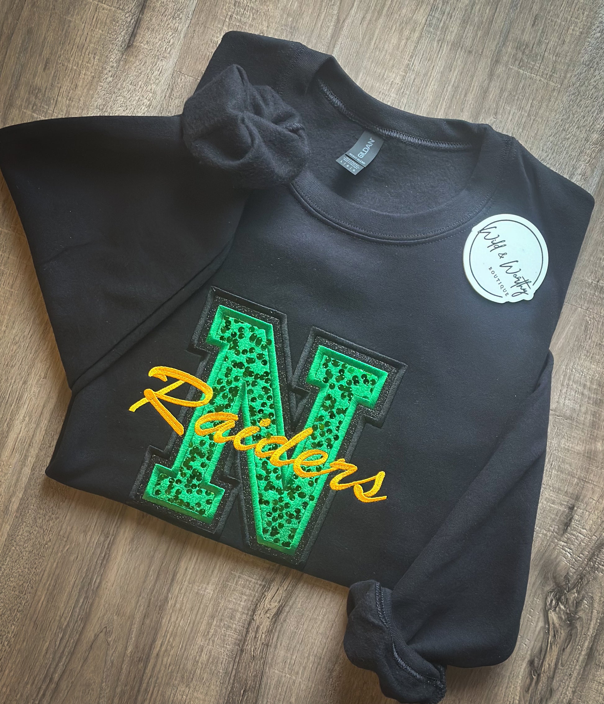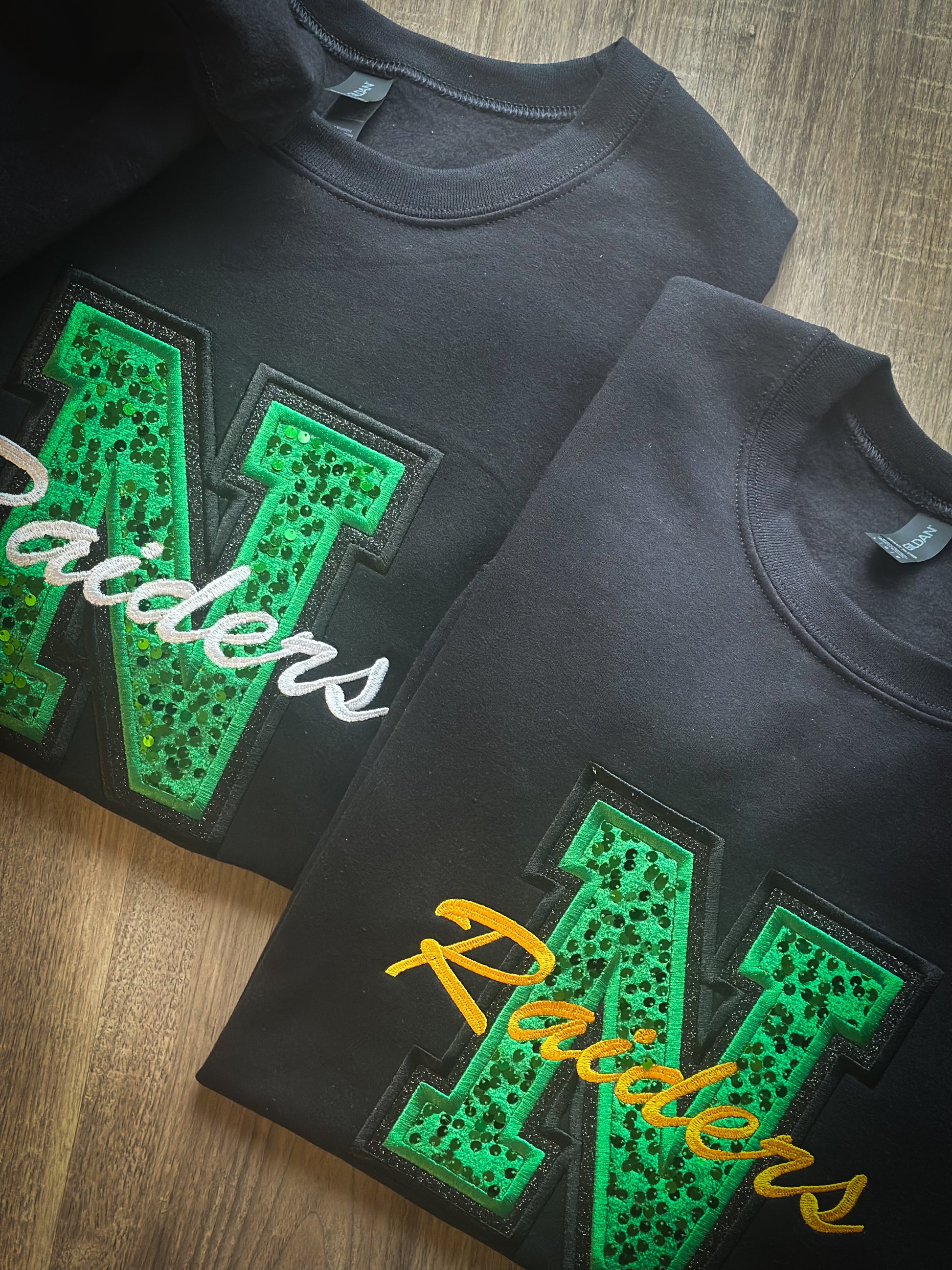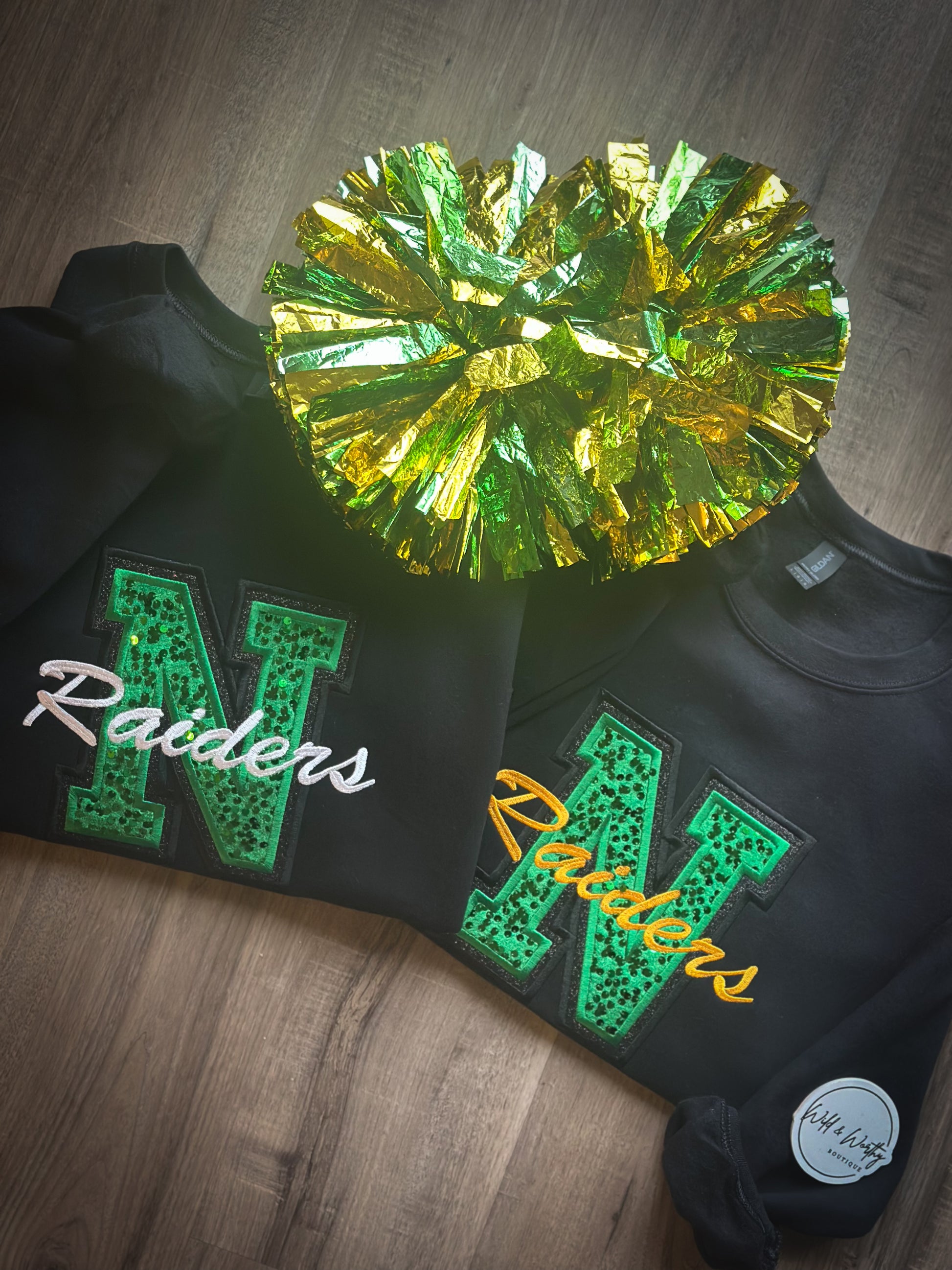 Bring the spirit and the sparkle. This varsity-style crew features luxe green sequin velvet panels paired with bold black glitter HTV for that perfect mix of glam + edge. “Raiders” hits across the center in crisp white or classic gold, making it pop whether you’re under the lights or in the stands. Cozy, statement-making, and guaranteed to turn heads—this crew was made for game days, pep rallies, and repping your team in style.