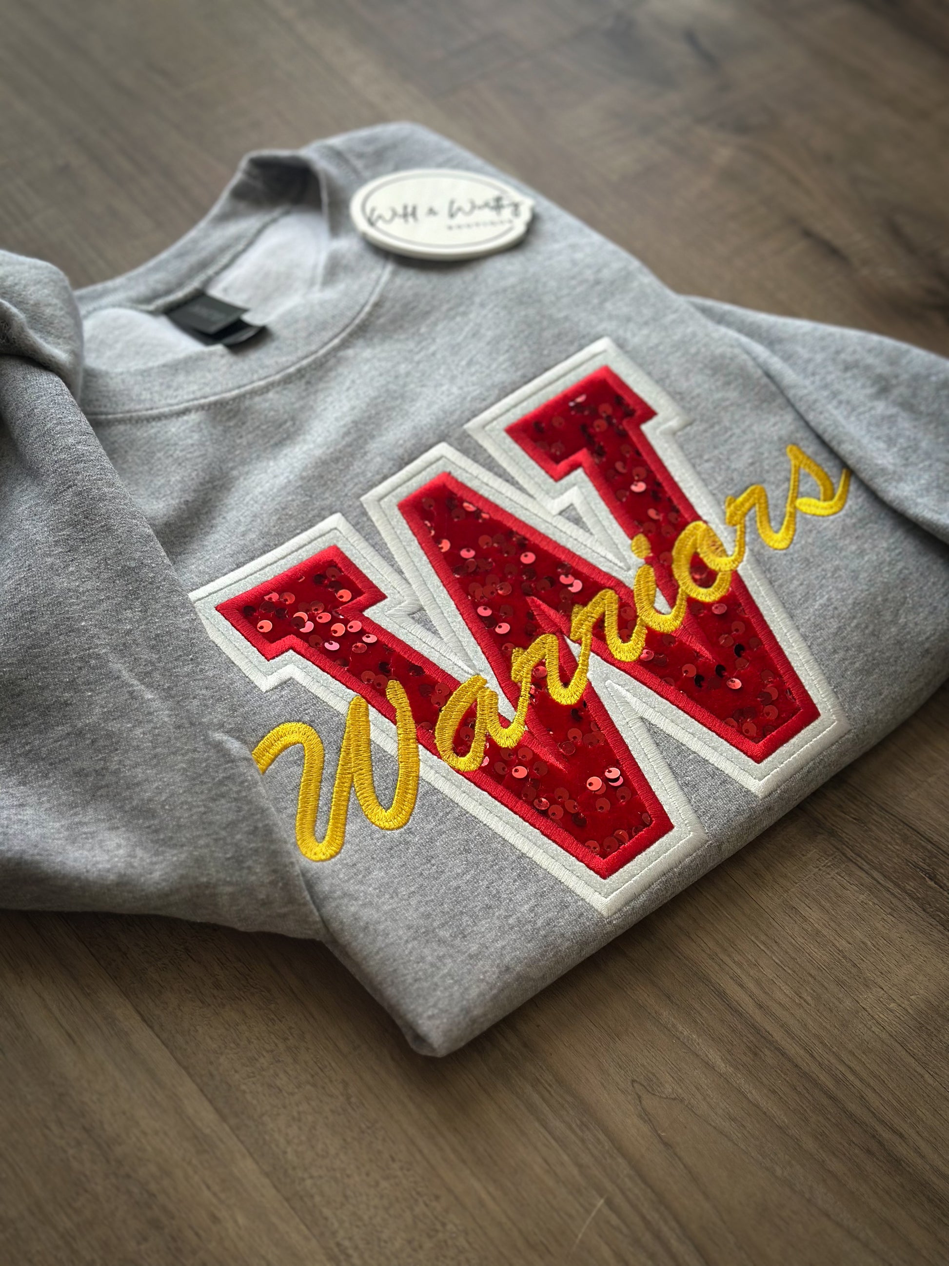 Bring the sparkle to every game day ✨ Our Sequin Spirit Varsity Crew is made to stand out in the stands. This cozy sport gray crewneck features a bold white glitter HTV base layered with a red sequin velvet W for the perfect mix of shine and texture. Finished with Warriors across the center in vibrant yellow, it’s a total show-stopper.