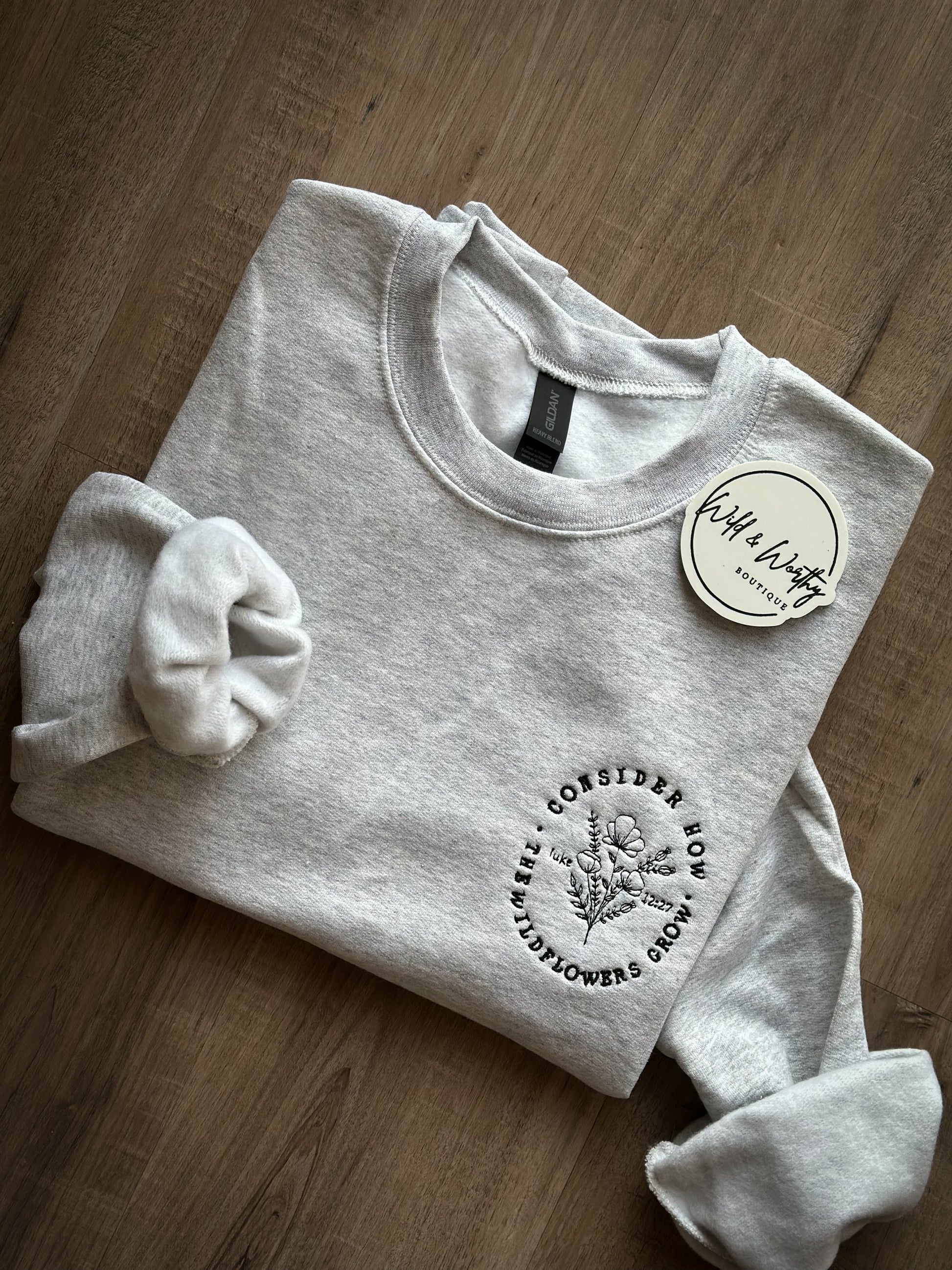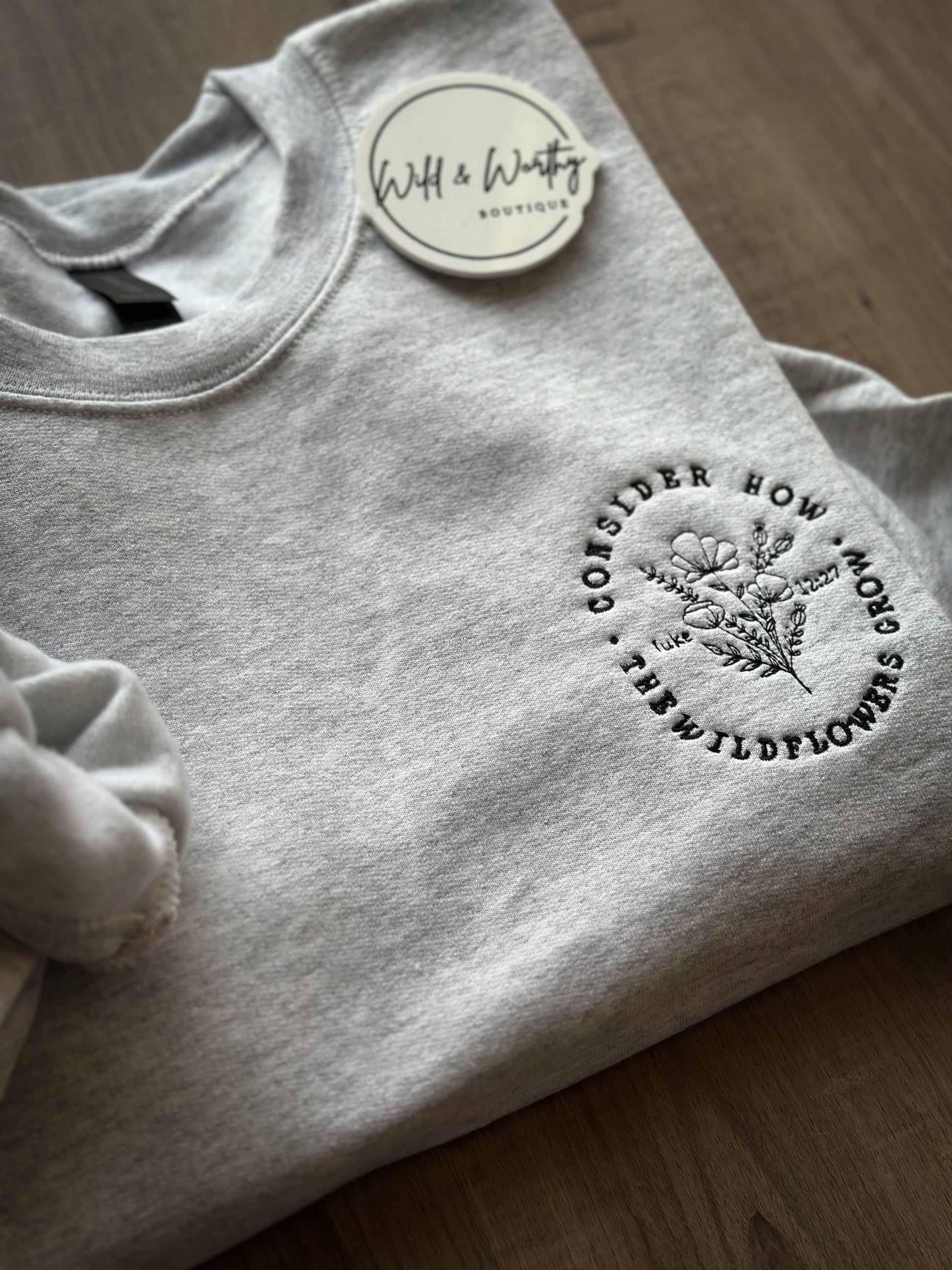 This ash gray crewneck features bold black lettering with “Consider how the wildflowers grow” from Luke 12:27, paired with a soft, beautiful wildflower bouquet design.